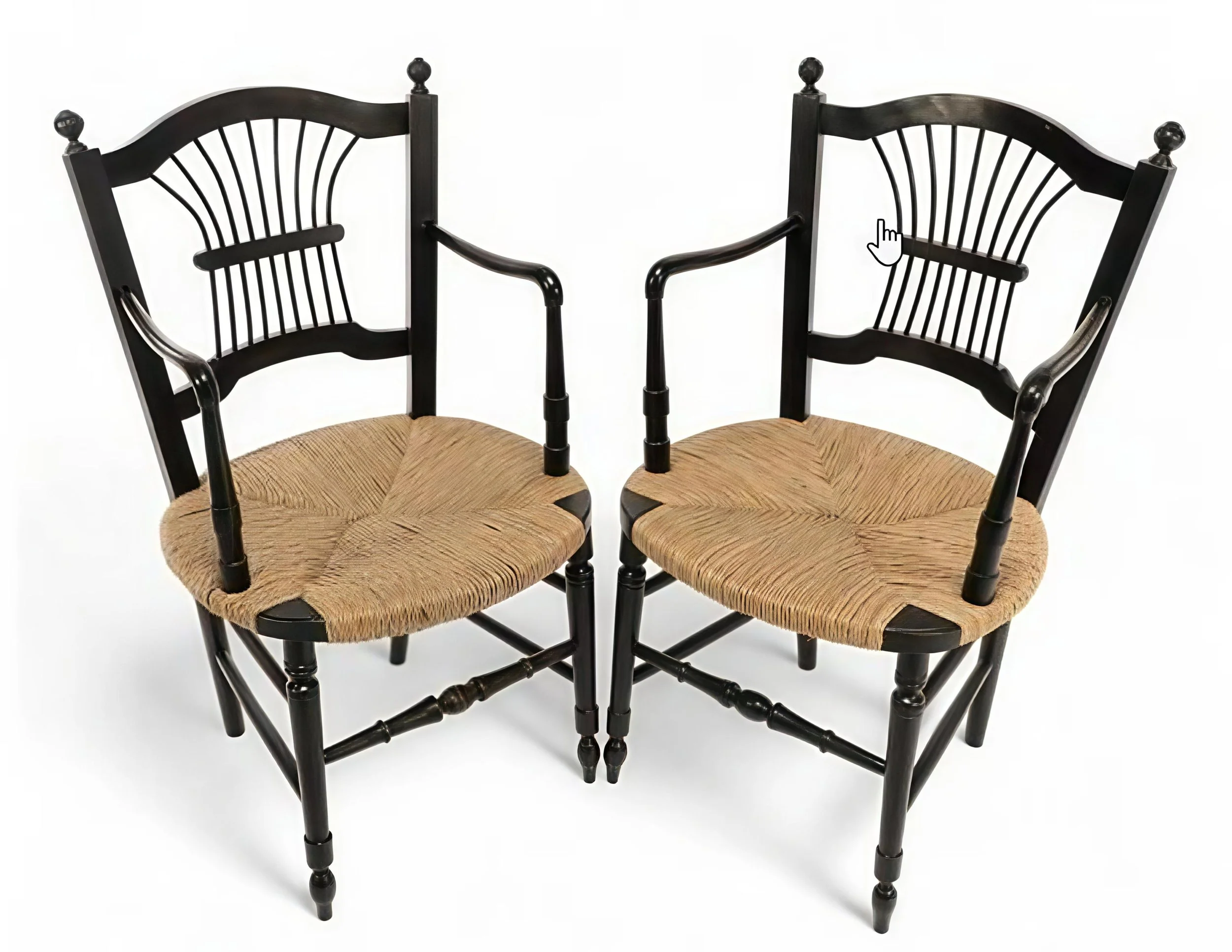 Pair of Rush-Seated Armchairs. Dante Gabriel Rossetti for Morris & Co. c. 1880. Image courtesy of Puritan Values. https://www.puritanvalues.com/product/dante-rossetti-for-morris-and-co-a-pair-of-morris-and-co-rush-seated-armchair. While the rush seats and turned elements evoke the vernacular, the ebonized frame and elegant lines point to the influence of Japan. Both mark these chairs unmistakably as Reform.