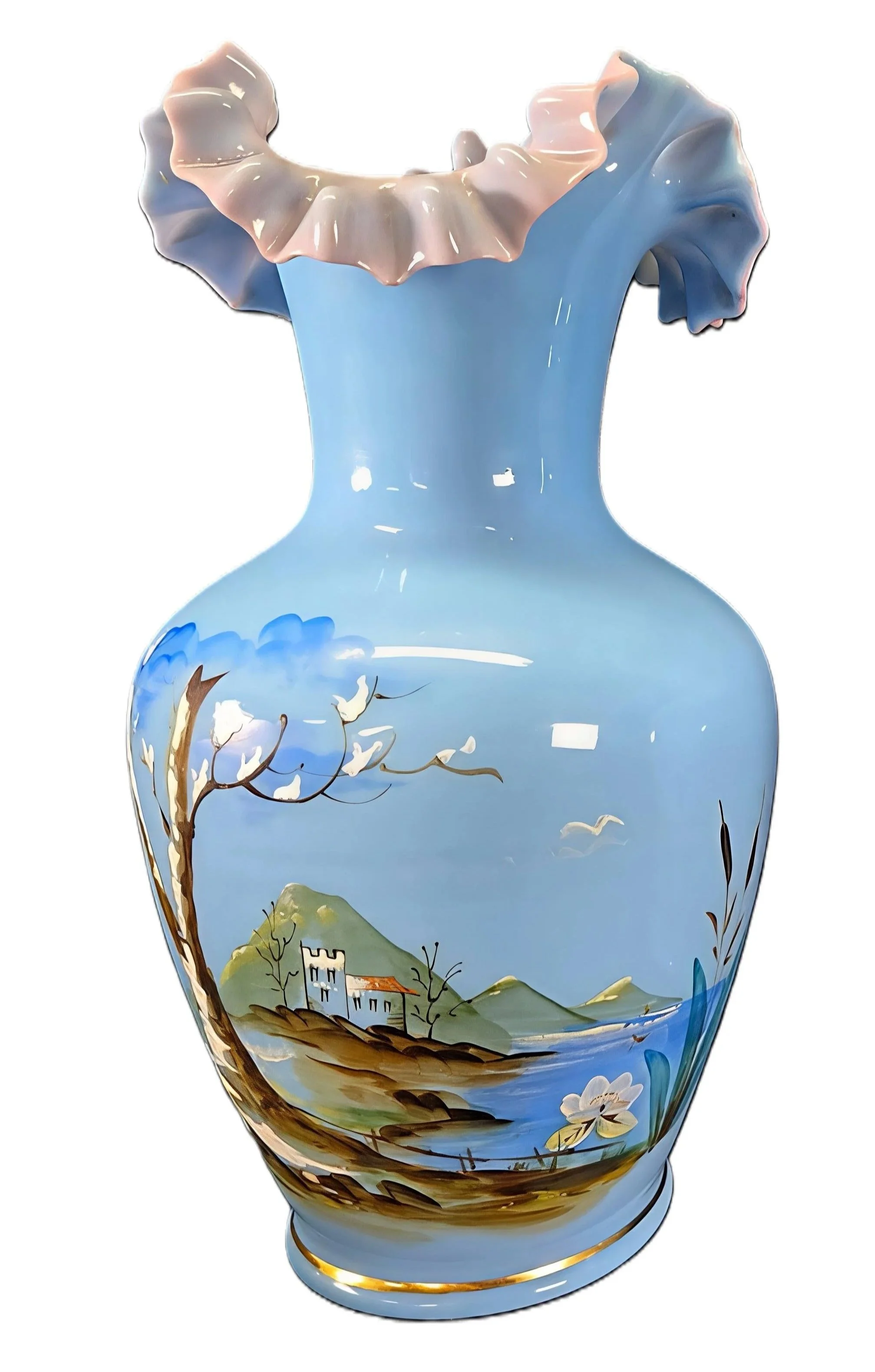 Victorian Bristol glass ruffle vase. One of a pair. Courtesy of Tailors Treasure Store hhttps://www.etsy.com/listing/1756671139/victorian-ruffled-edge-bristol-glass