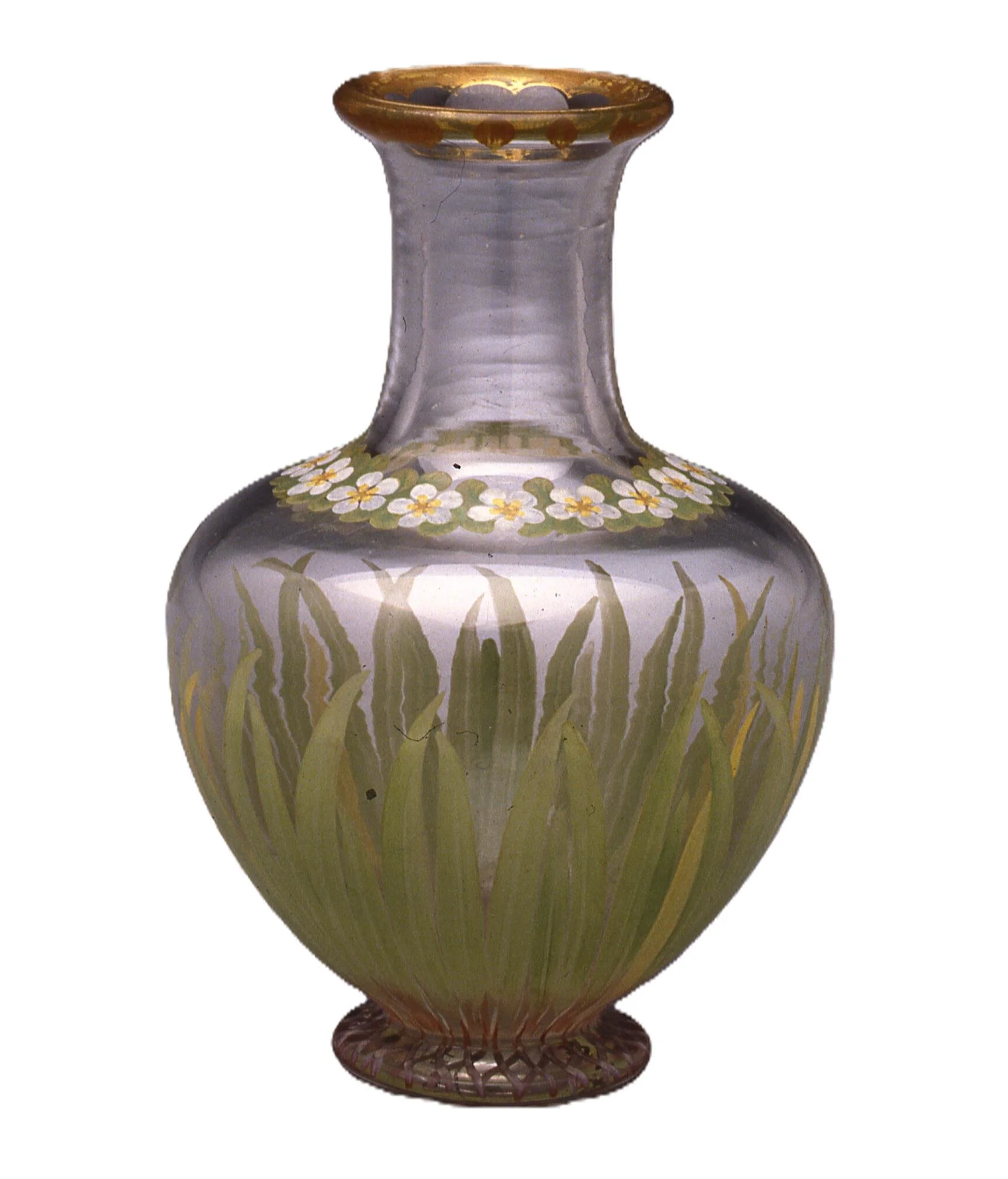 This “mainstream” Victorian Bristol glass vase has been completely covered in paint, obscuring the basic material, so looking more like a ceramic than glass. And the scene depicted, while charming and somewhat following the form of the vessel, is more suitable for an easel picture than a vase. So too much “inappropriateness” for design reformers.