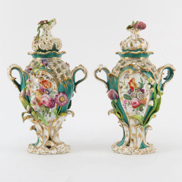 A pair of English, “Victorian”, Rococo Revival porcelain urns. c. 1835. Image courtesy of Liveauctioneers.com